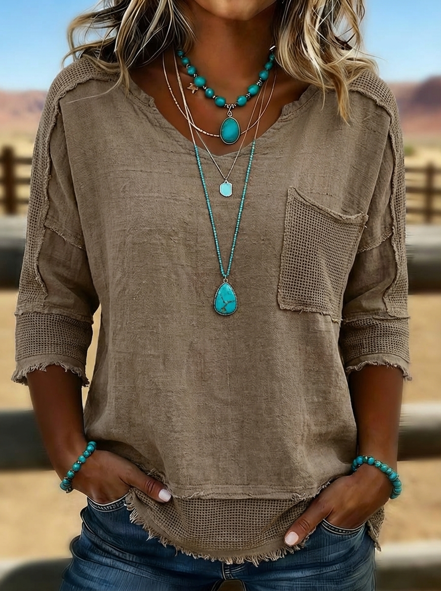 🏜️ Raw & Refined – Deconstructed Linen-Look Pocket Tee For the woman who loves natural textures and a "lived-in" luxe feel. This taupe top features raw-edge detailing and a unique mesh-textured pocket for a modern, rustic vibe.