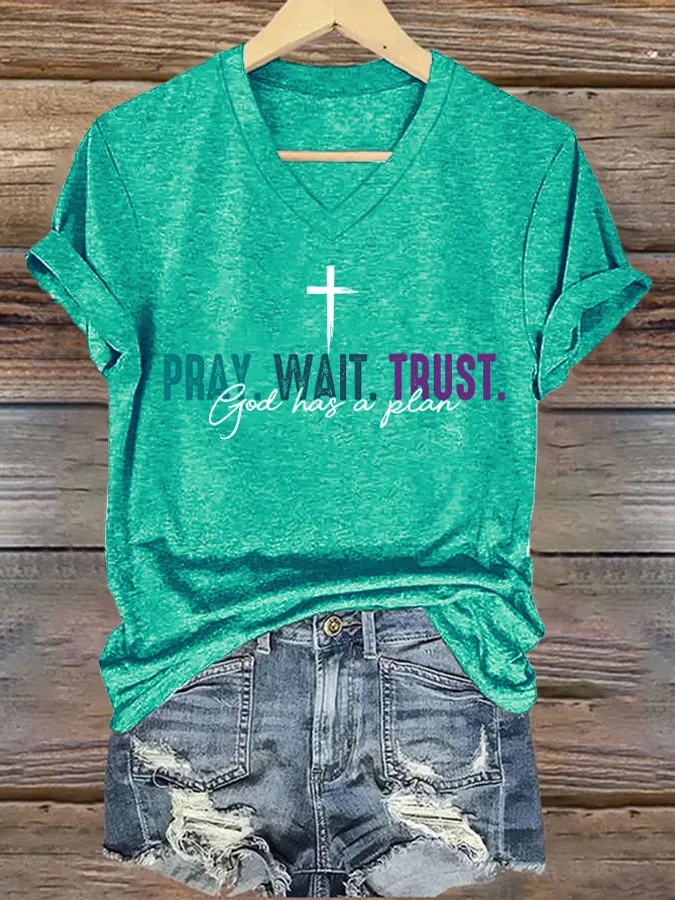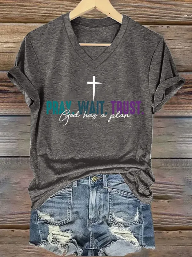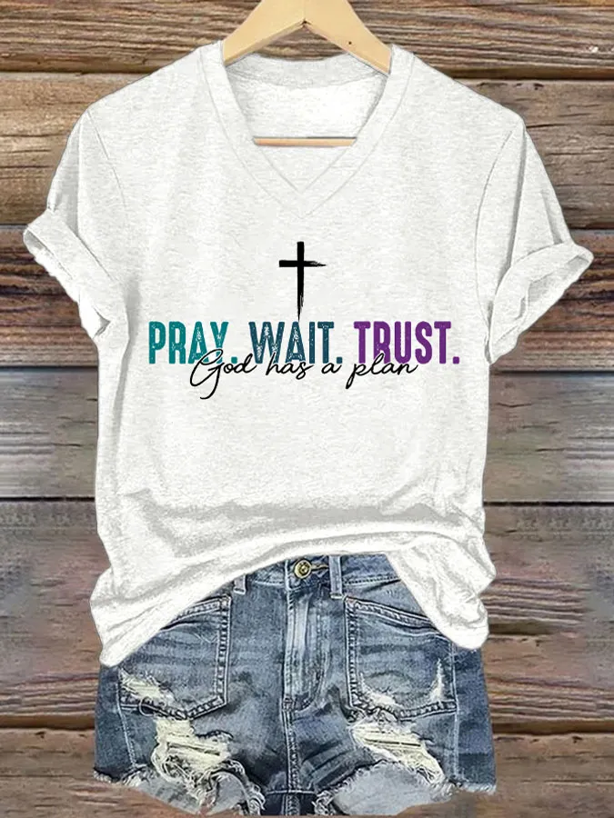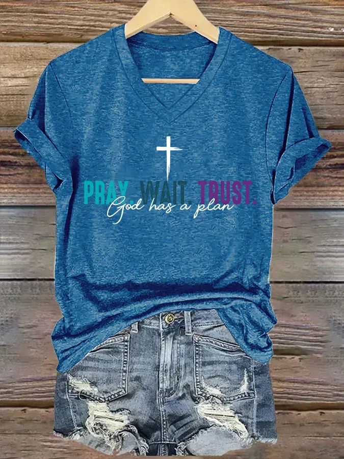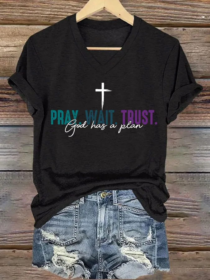 V-neck Retro Pray Wait Trust Jesus Has A Plan The Cross Print T-Shirt