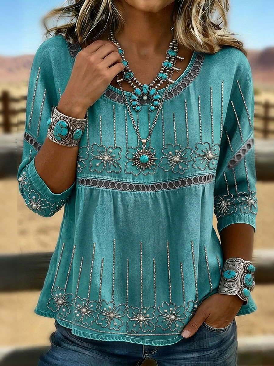 🌵 Capture the Spirit of the West – Turquoise Embroidered Boho Blouse