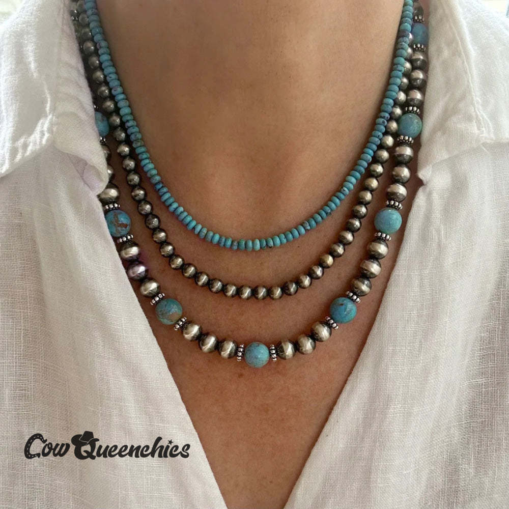 Elevate your accessory game with this stunning Navajo Turquoise Triple Necklace Set. Featuring three strands of turquoise beads, interspersed with silver and darker accents, this set creates a beautiful gradient effect. Perfect for adding a touch of elegance and cultural flair to any outfit.