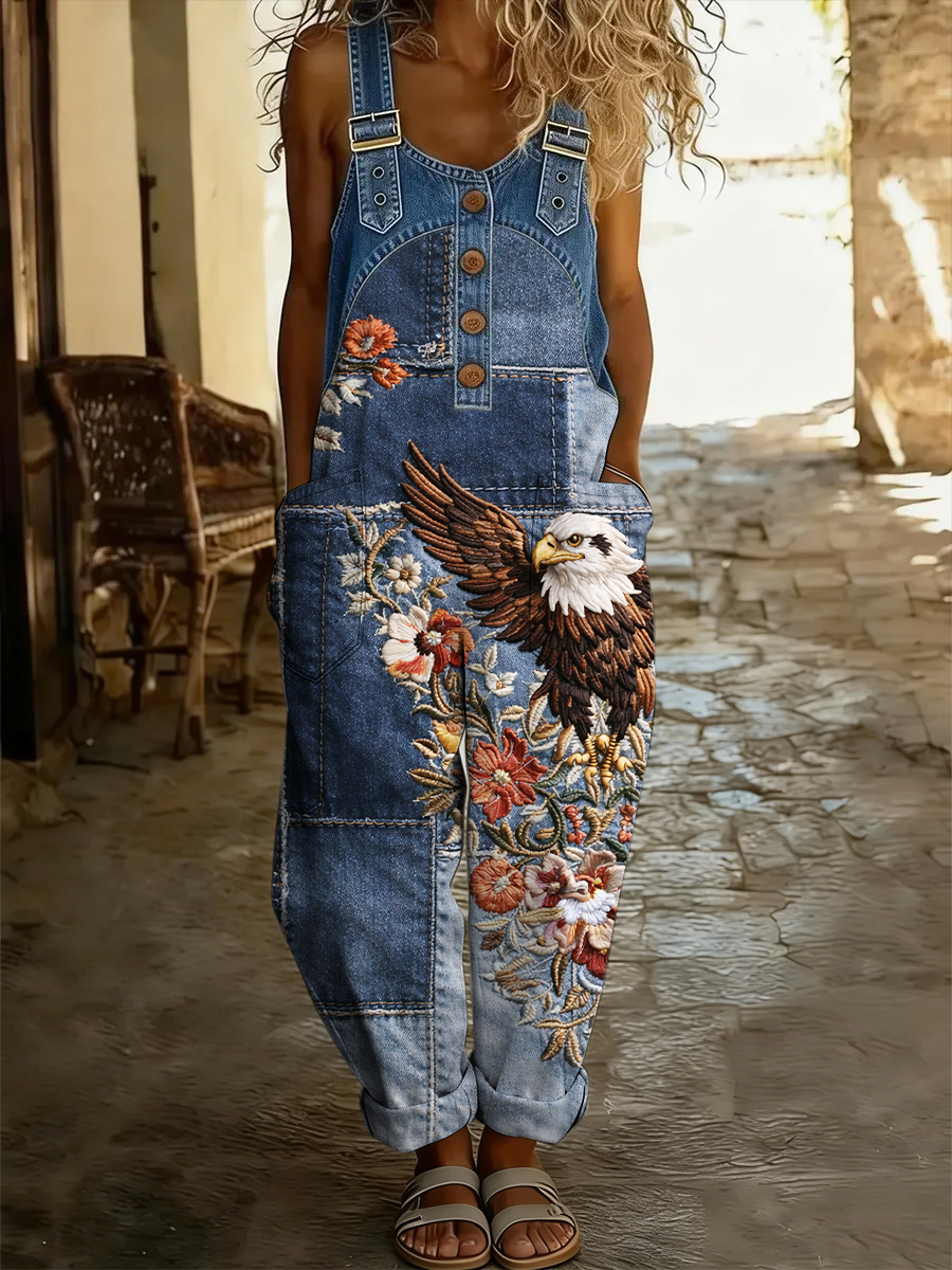 Women's American Flag Art Print Washed Cotton Denim Patchwork Jumpsuit