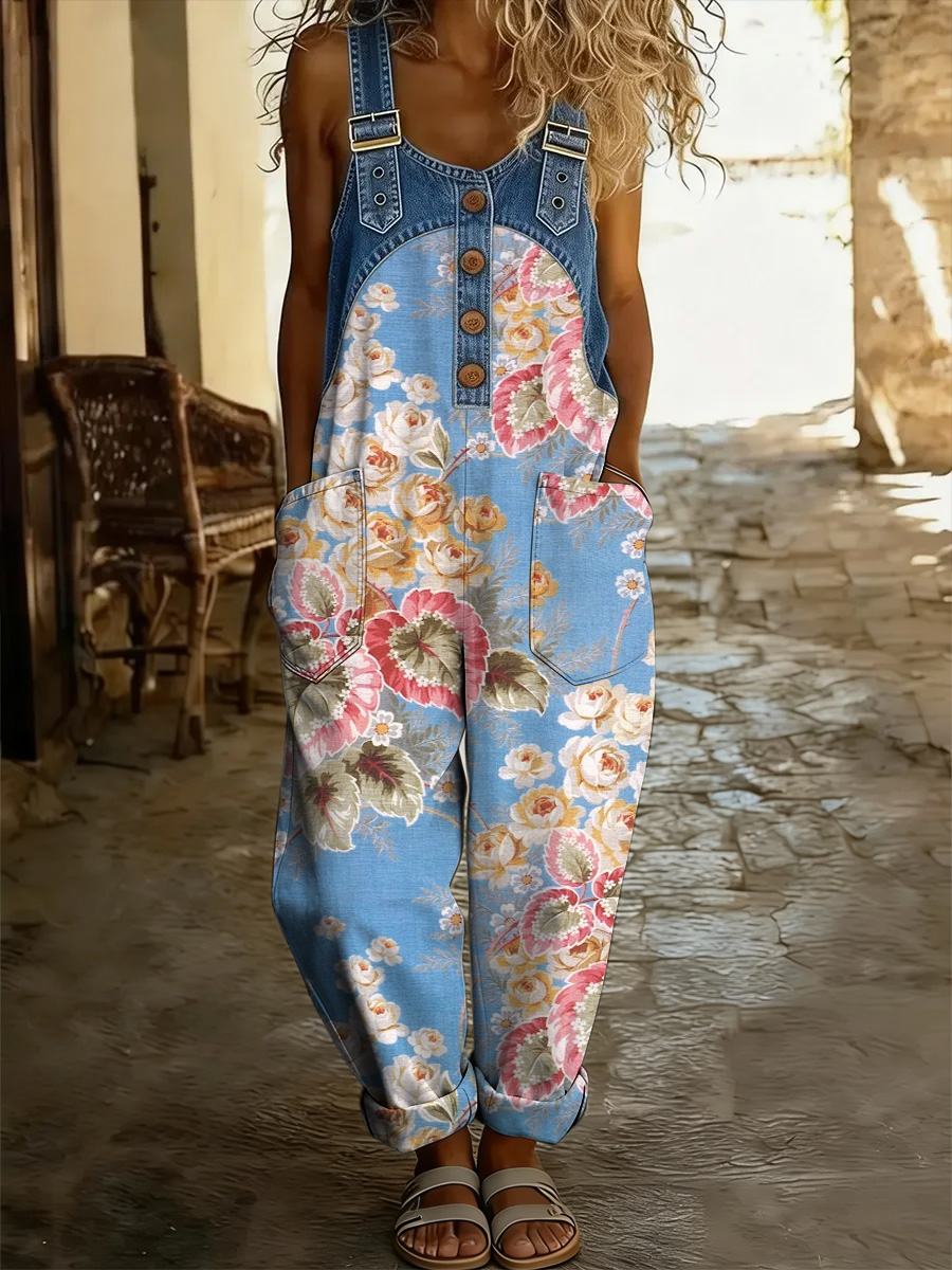 Women's Boho Style Art Print Washed Cotton Denim Patchwork Jumpsuit