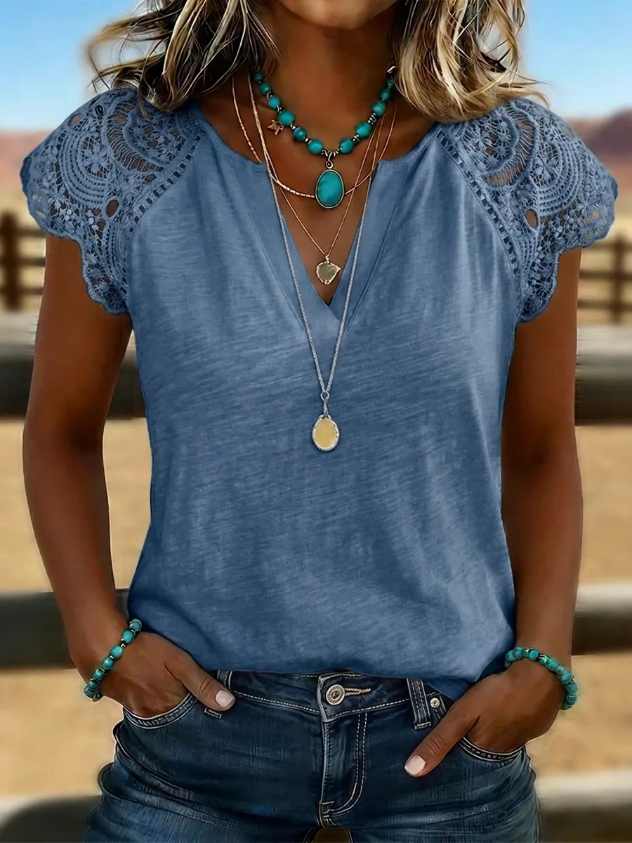 🦋 Feminine & Free – Lace-Sleeve V-Neck Summer Top Elevate your basic tee collection with this vibrant sky-blue top. Featuring romantic crochet-lace sleeves, it offers a refined take on casual summer dressing.