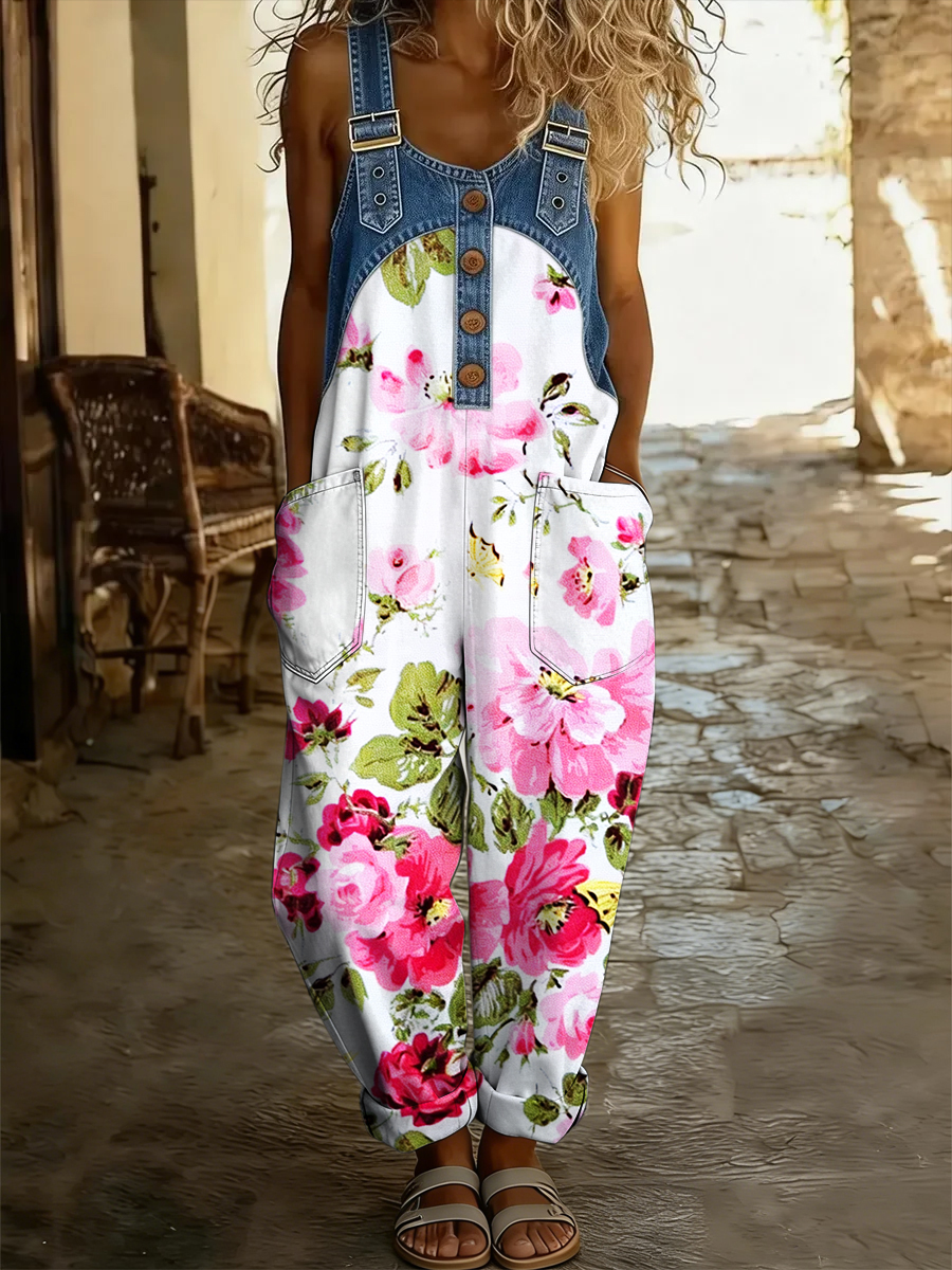 Women's Floral Art Print Washed Cotton Denim Patchwork Jumpsuit
