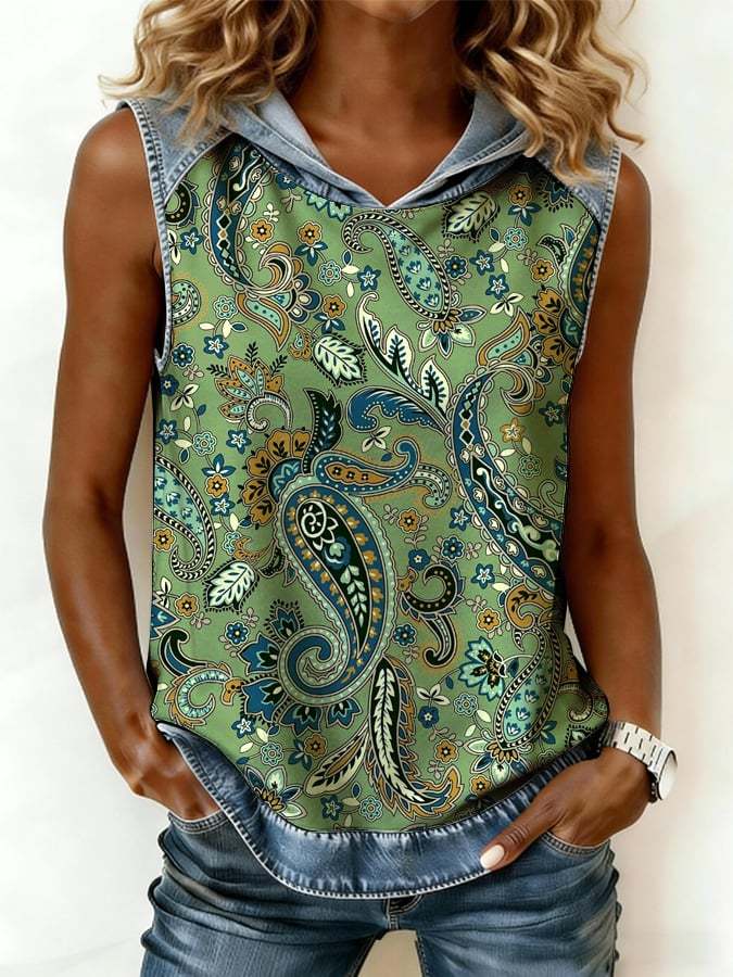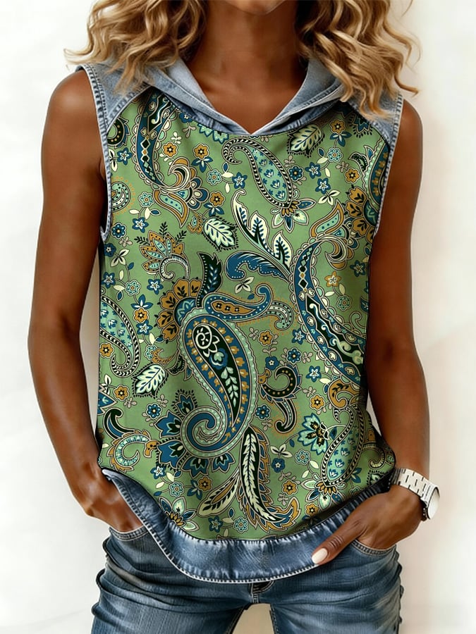 Women's Retro Western-Style Denim-Paneled & Printed Hooded Vest
