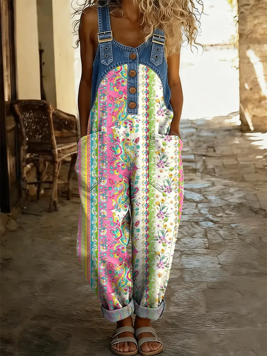 Women's Striped Bohemian Colorful Floral Art Print Casual Washed Cotton Denim Patchwork Jumpsuit