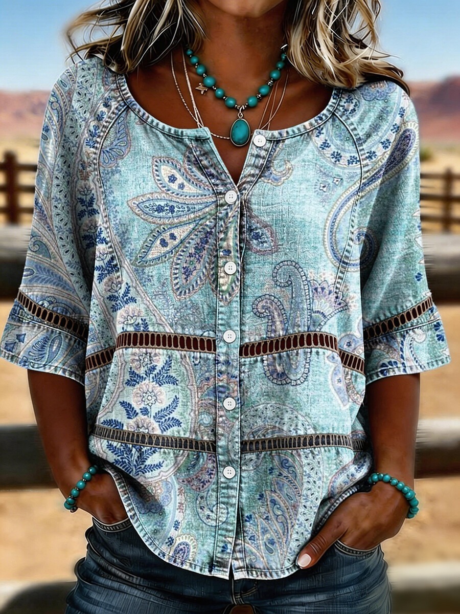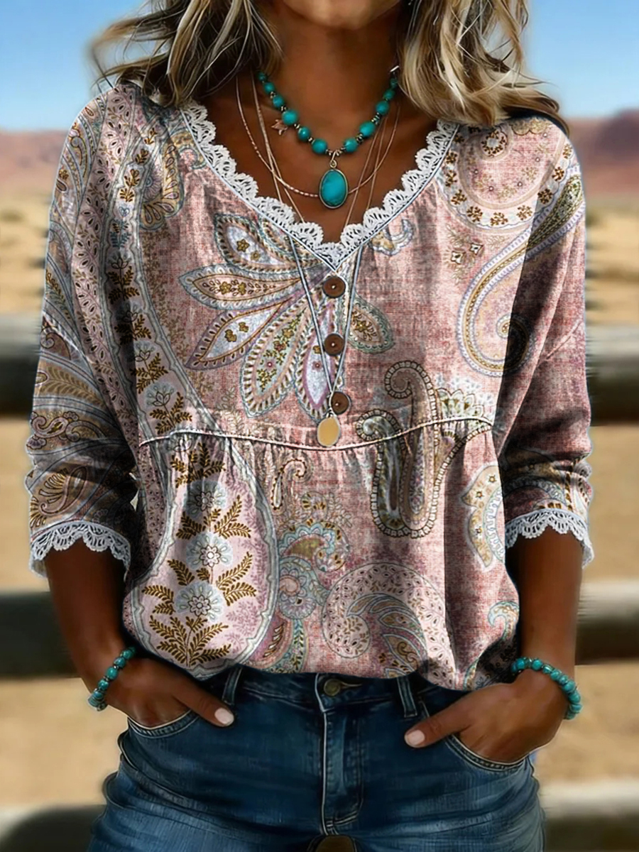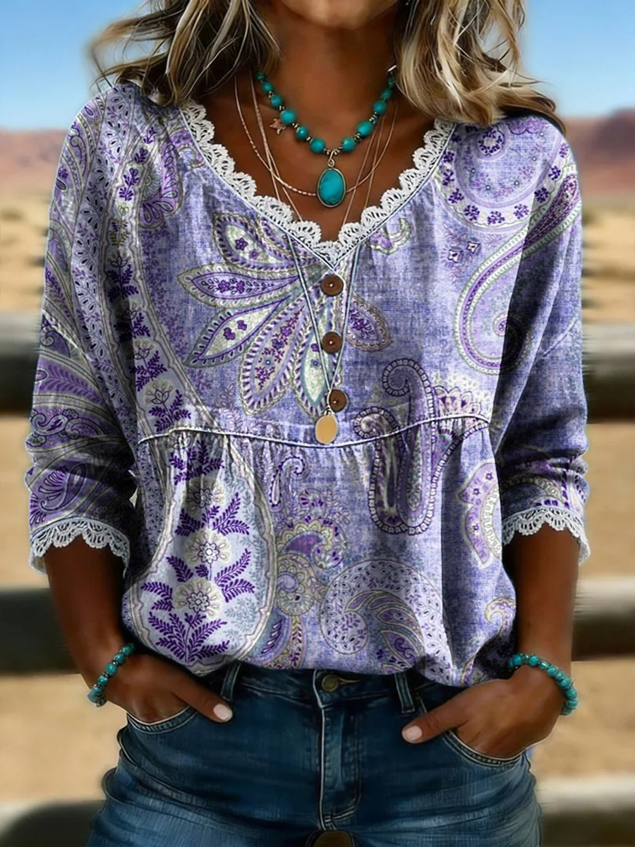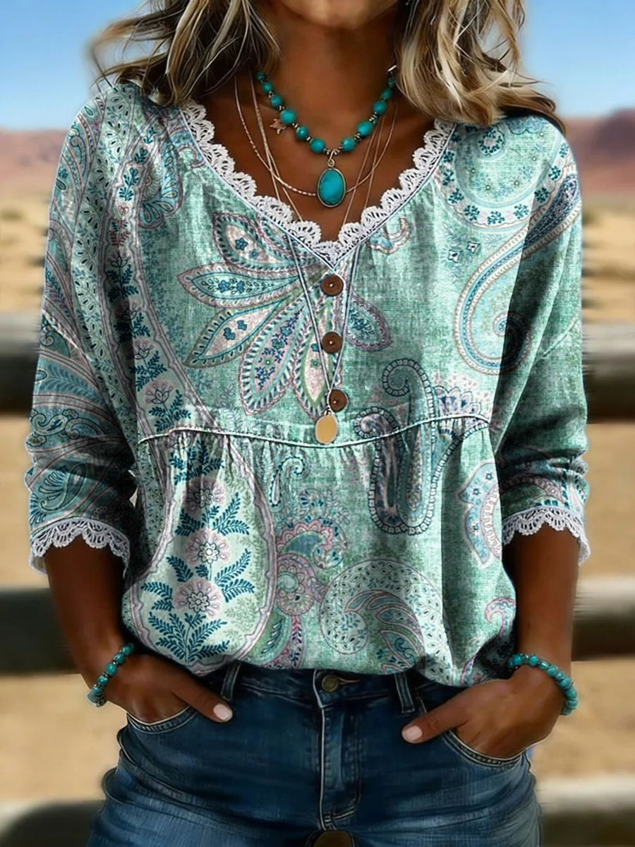 🌸 Bohemian Heritage – Lace-Trimmed Paisley V-Neck A masterpiece of Boho-chic design. This blouse features a rich, swirling paisley print framed by a delicate white lace-trimmed V-neck and matching sleeve cuffs.